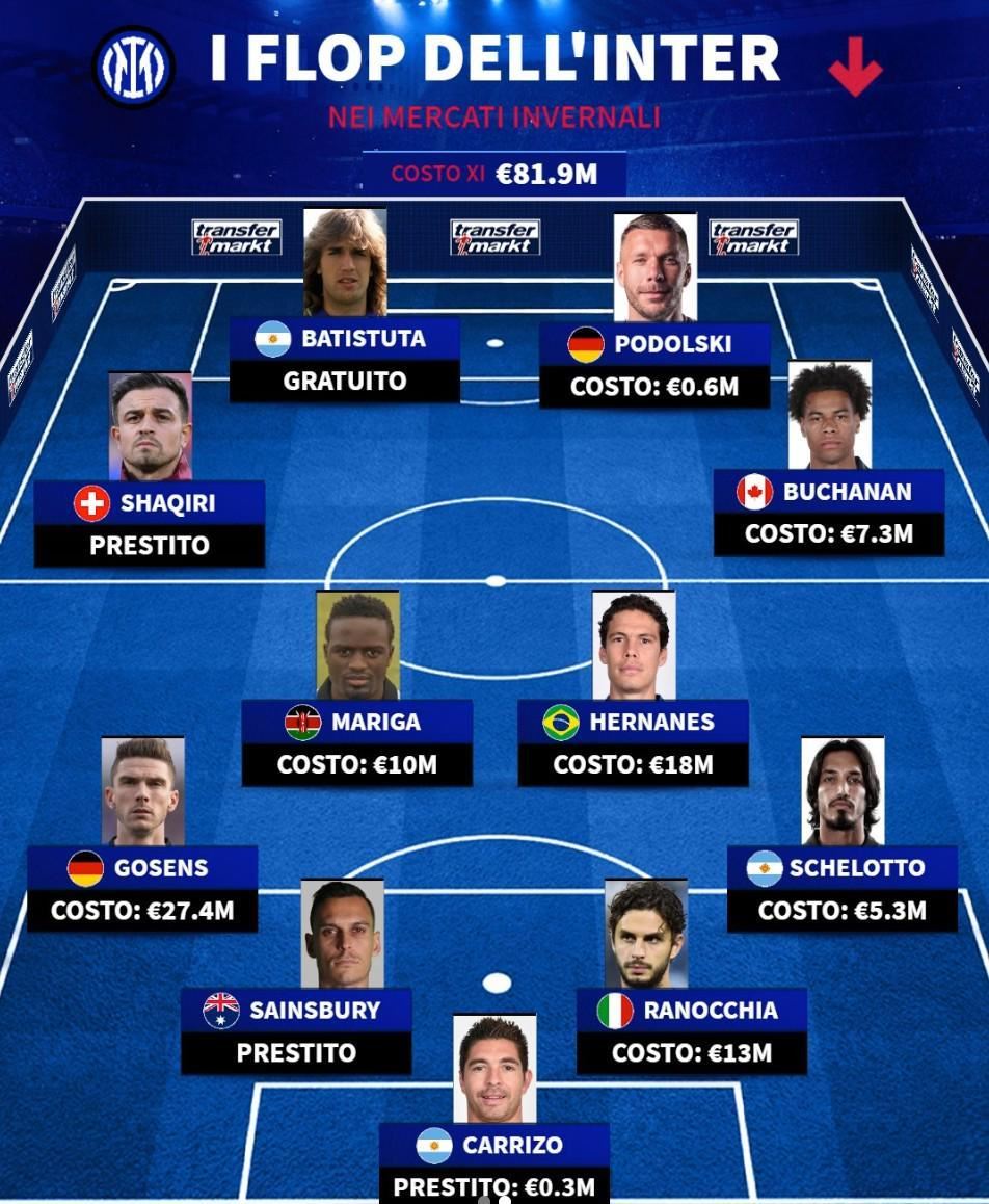 北京时间1月9日,德转列出了国际米兰队史冬窗引援的最成功11人阵容,阿德里亚诺、埃里克森以及长友佑都上榜,同时他们也列出了蓝黑军团冬窗引援的失败11人,巴蒂斯图塔、波多尔斯基以及沙奇里在列。