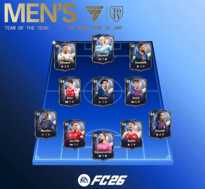 北京时间1月15日,EA公布了FC26年度蓝的正选名单,姆巴佩、哈兰德、登贝莱搭档锋线,中场则是赖斯、维蒂尼亚和佩德里,11人当中有7人都是首次进入正选。FC26正选名单锋线:姆巴佩、哈兰德、登贝莱中场:赖斯、维蒂尼亚、佩德里后卫:努诺-门德斯、范戴克、萨利巴、孔德门将:多纳鲁马另外据各博主爆料以及FC Online韩服的公告来看,第12人将是亚马尔。
